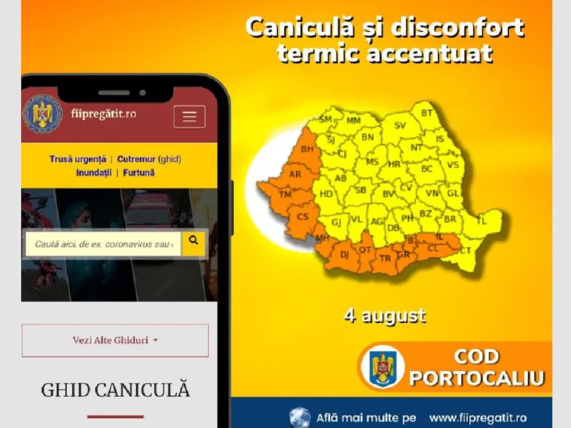 Meteorologii au emis o avertizare de tip Cod Portocaliu de caniculă și disconfort termic accentuat și atrag atenția că temperaturile vor ajunge până la 39...41 de grade C în în jumătatea de sud a Olteniei și a Munteniei”, a transmis IGSU.