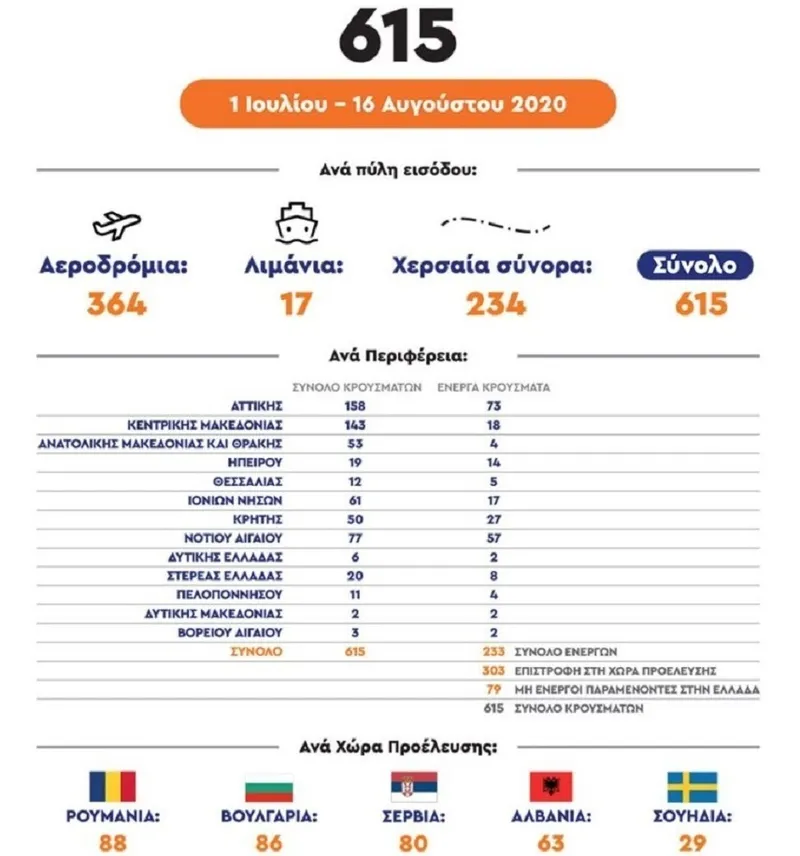Din totalul de 615 de cazuri confirmate în rândul turiştilor, sunt active 233. Alte 73 de persoane la care virusul nu mai e activ au rămas în Grecia, iar 303 s-au întors în ţările de origine.