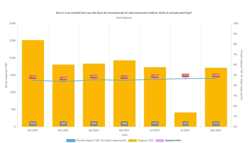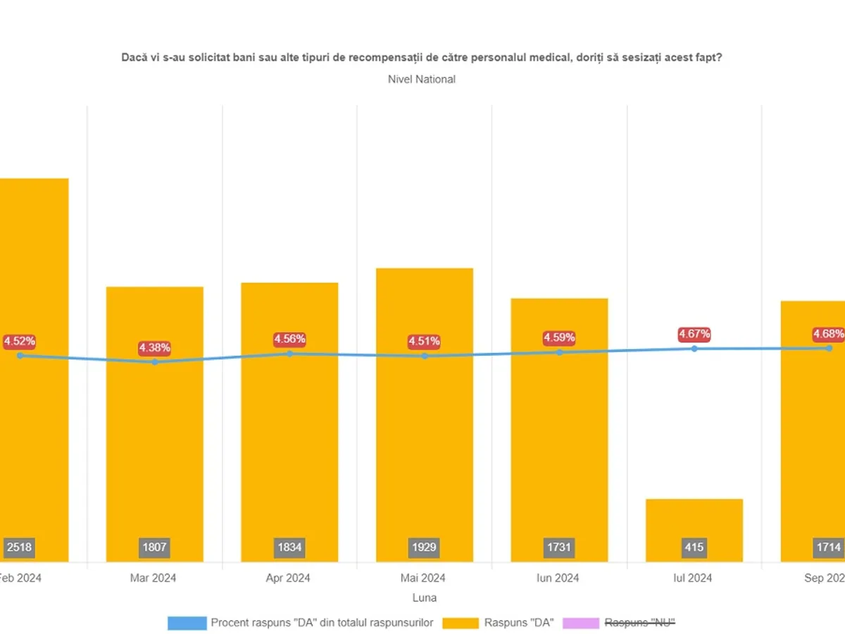 Din graficele făcute de graphs.ro pentru fiecare spital, pe județe și la nivel național, arată o scădere dramatică a cazurilor de mită în luna iulie.