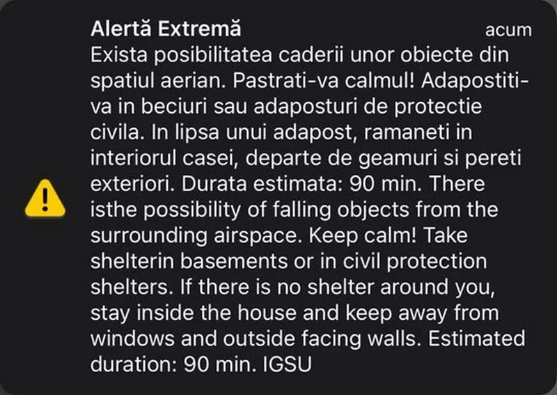 “Alertele au fost emise în urma identificării pe teritoriul Ucrainei, în apropierea graniţei cu România, de către structurile naţionale cu rol de apărare, a unor aparate de zbor care ar putea avea ca ţintă obiective din apropierea graniţei de pe teritoriul ucrainean. Mesajele RO-Alert au drept scop informarea populaţiei cu privire la modul de comportare în asemenea situaţii, recomandarea de păstrare a calmului şi măsuri de autoprotecţie”, au transmis reprezentanţii ISU Tulcea, informează News.ro.