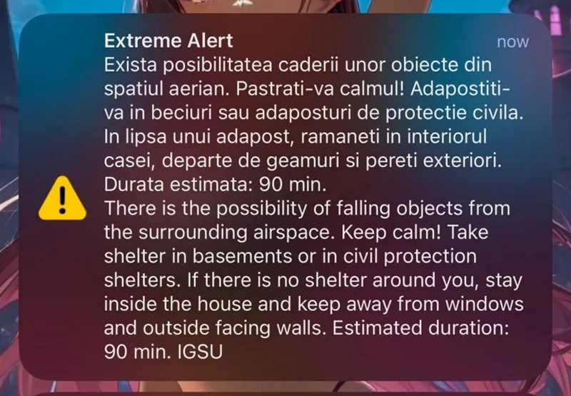 „Mesajul transmite informații de avertizare și de informare a populației cu privire la posibilitatea căderii unor obiecte din spațiul aerian și măsuri de adăpostire în cazul în care situația o impune.