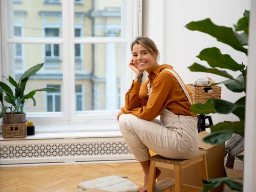 Femeie privind pe geamul apartamentului - Foto: Freepik