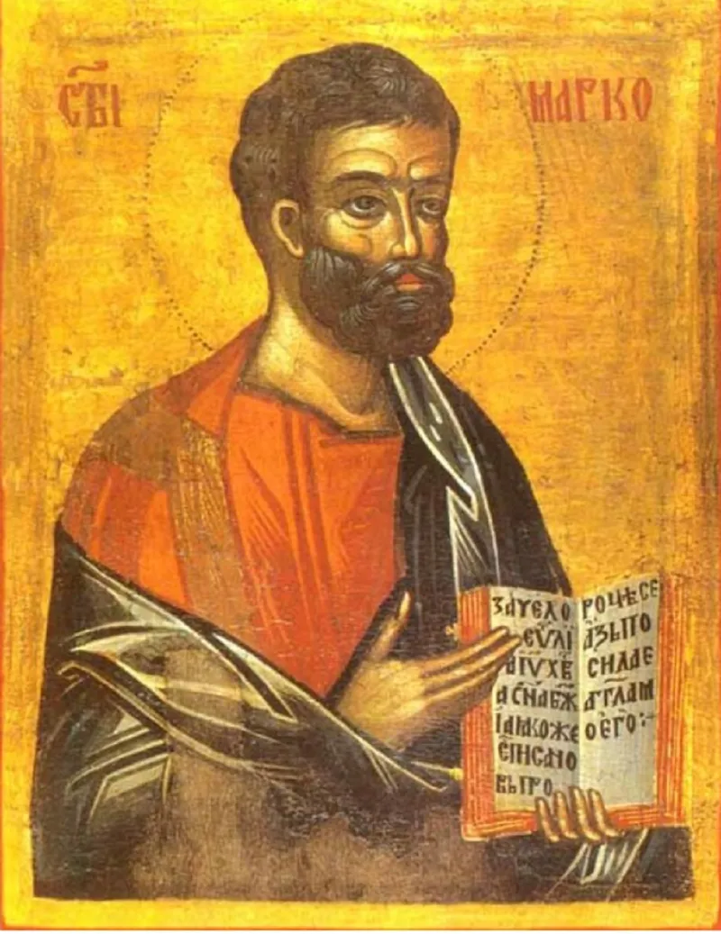 "Sfântul Evanghelist Marcu era de neam evreu, din seminţia lui Levi, ucenic al Sfântului Apostol Petru şi fiu iubit al aceluia întru Sfântul Duh, pe care îl pomeneşte în scrisoarea sa, zicând: 'Vă sărută pe voi aleasa Biserică din Babilon şi Marcu, fiul meu'.