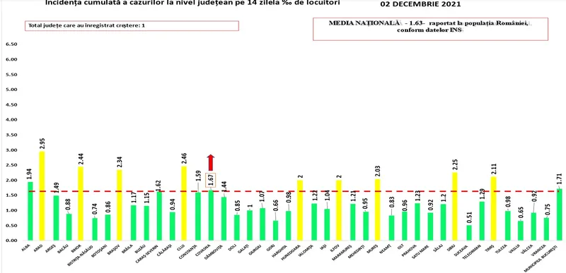 Coeficientul infectărilor cumulate la 14 zile, raportate la 1.000 de locuitori este calculat de către Direcțiile de Sănătate Publică, la nivelul Municipiului București și al județelor. Mai jos aveți graficul realizat în baza raportărilor primite de CNCCI de la Direcțiile de Sănătate Publică:
