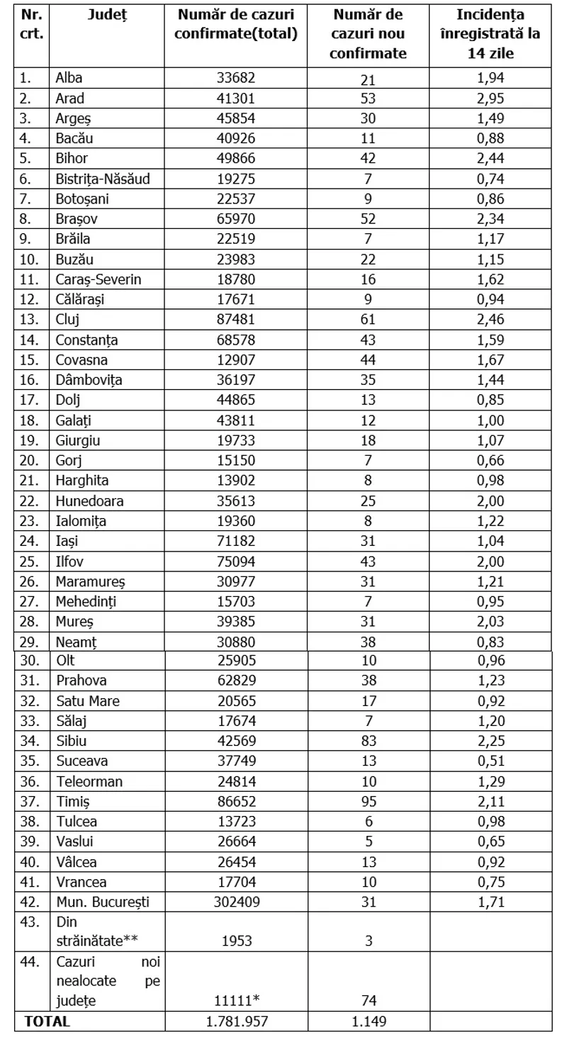 Distribuția pe județe a cazurilor per total și a celor noi o regăsiți în tabelul de mai jos: