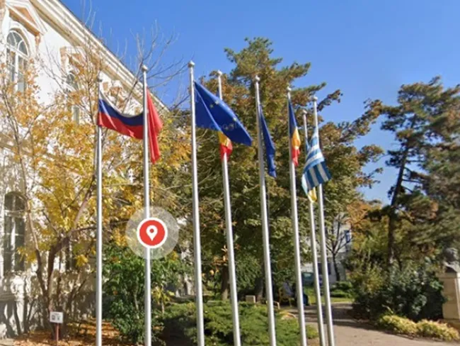 Steagul Rusiei este arborat într-o zonă centrală din municipiul Tulcea, lângă Muzeul de Artă, alături de al Ucrainei şi al altor state.
