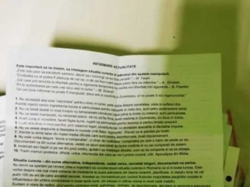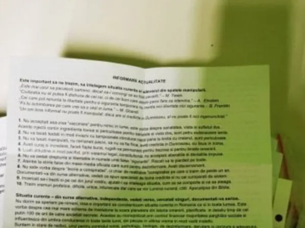 Numeroşi ieşeni au semnalat că au început să primească în căsuţa poştală de pe casa scării mesaje conspiraţioniste, care îndeamnă populaţia „să nu acceptaţi aşa-zisa vaccinare pentru nimic în lume. Este vorba despre sănătatea, viaţa şi sufletul dumneavoastră“.