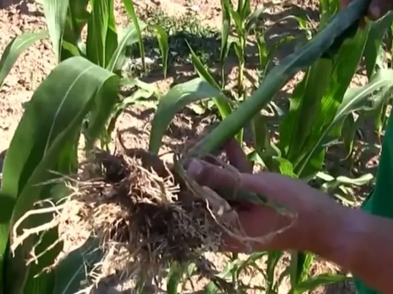 "Clar e că rădăcina trebuia să fie mult mai dezvoltată și mult mai bine ramificată. În acest moment, porumbul trebuia să fie perfect fecundat, trebuia să aibă o talie de cel puțin doi metri și să fie uniform, ceea ce nu este aici", spune un fermier.