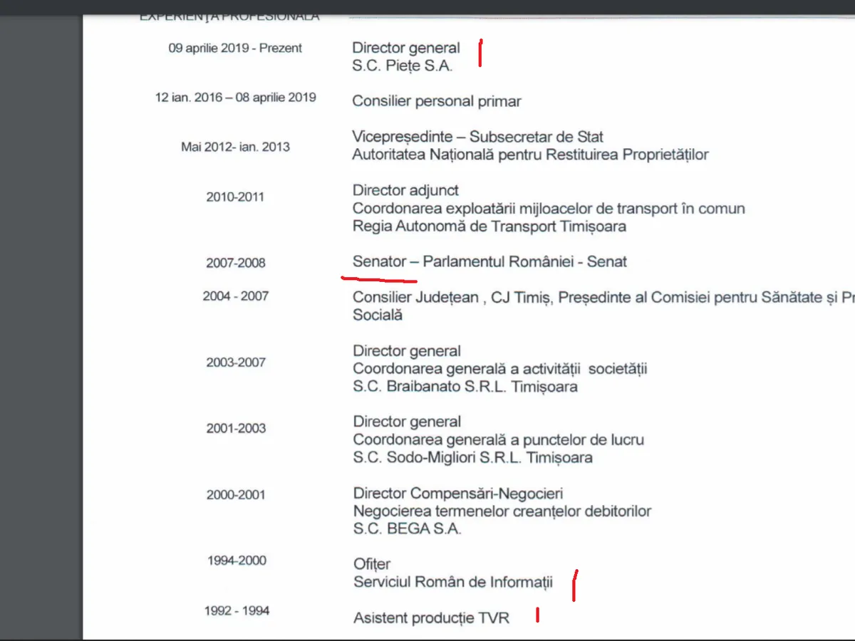 Ionuț Nasleu are un CV extrem de pestriț, acesta menționând mai multe instituții de stat în carieră: TVR, SRI, Senat, Primăria Timișoara.