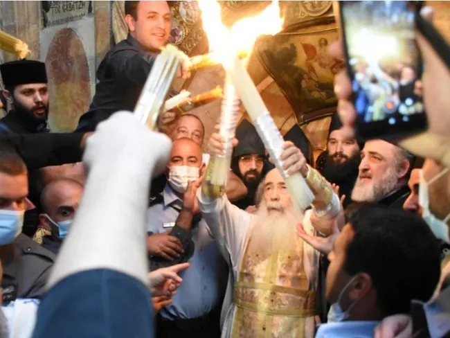 Lumina este adusă credincioşilor de Patriarhul Ierusalimului.