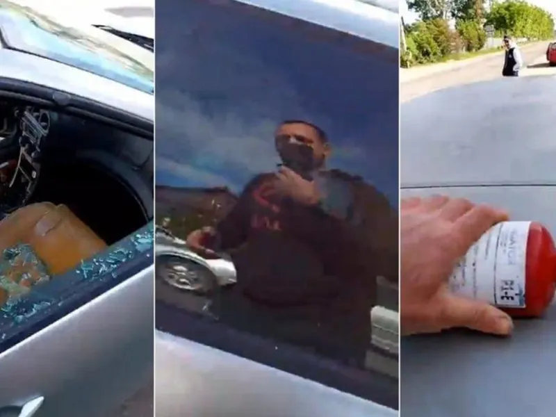 În acel moment, şoferul şi-a ieşit din minţi şi a început să îşi distrugă singur maşina, cu ajutorul unui extinctor. Astfel, el a spart geamurile autoturismului, dar şi stopurile.