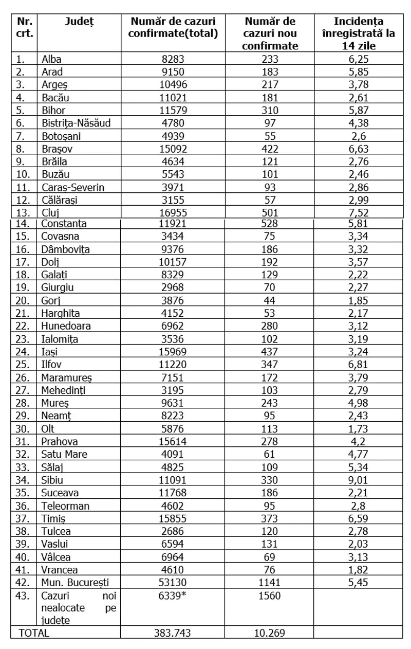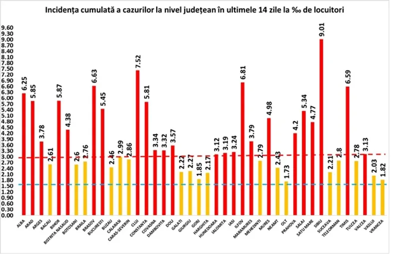 Coeficientul infectărilor cumulate la 14 zile, raportate la 1.000 de locuitori este calculat de către Direcțiile de Sănătate Publică, la nivelul Municipiului București și al județelor. Mai jos puteți consulta graficul realizat în baza raportărilor primite de CNCCI de la Direcțiile de Sănătate Publică, transmis de Grupul de Comunicare Strategică: