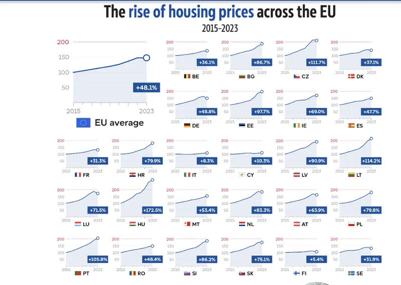 În mai puțin de 10 ani, între 2015 și 2023, prețurile locuințelor în UE au crescut în medie cu 48%. Cea mai mare creștere este înregistrată în Ungaria, unde prețurile au crescut cu 173%, iar cea mai mică în Finlanda, cu doar 5%.