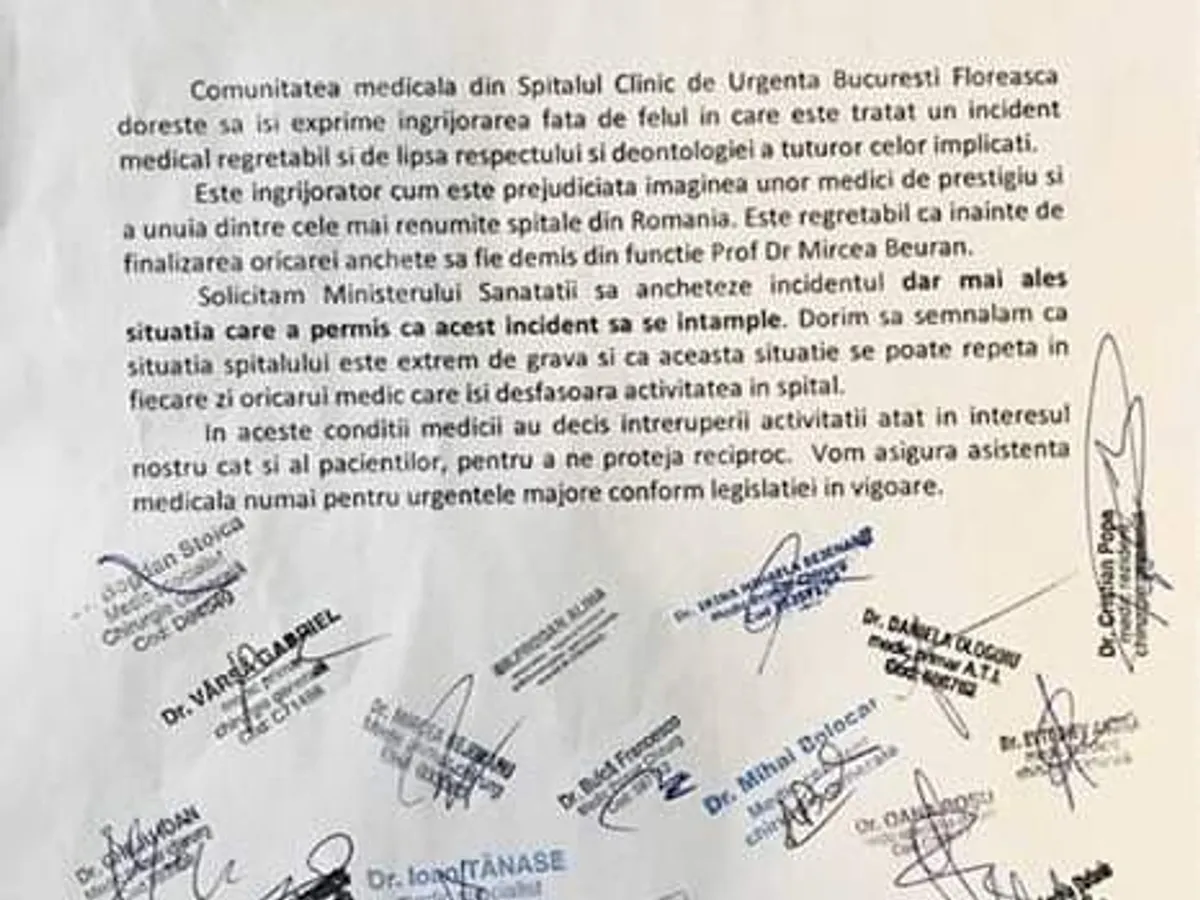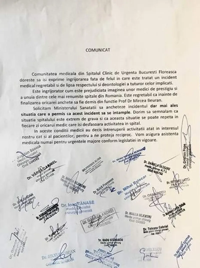 25 de medici de la Spitalul Clinic de Urgență Floreasca din București îi iau apărarea printr-o scrisoare deschisă chirurgului Mircea Beuran, demis de ministrul Sănătății de la șefia Secției de Chirurgie, după ce o pacientă a fost arsă în timpul unei operații și apoi a murit.