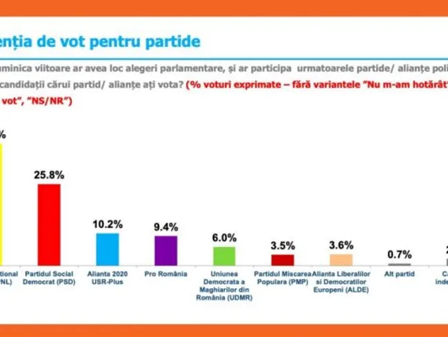 Clasamentul este completat de alianța USR PLUS (10,2%), Pro România (9,4%) și UDMR (6%). PMP (3,5%) și ALDE (3,6%) ar rămâne sub pragul electoral, potrivit datelor Inscop.