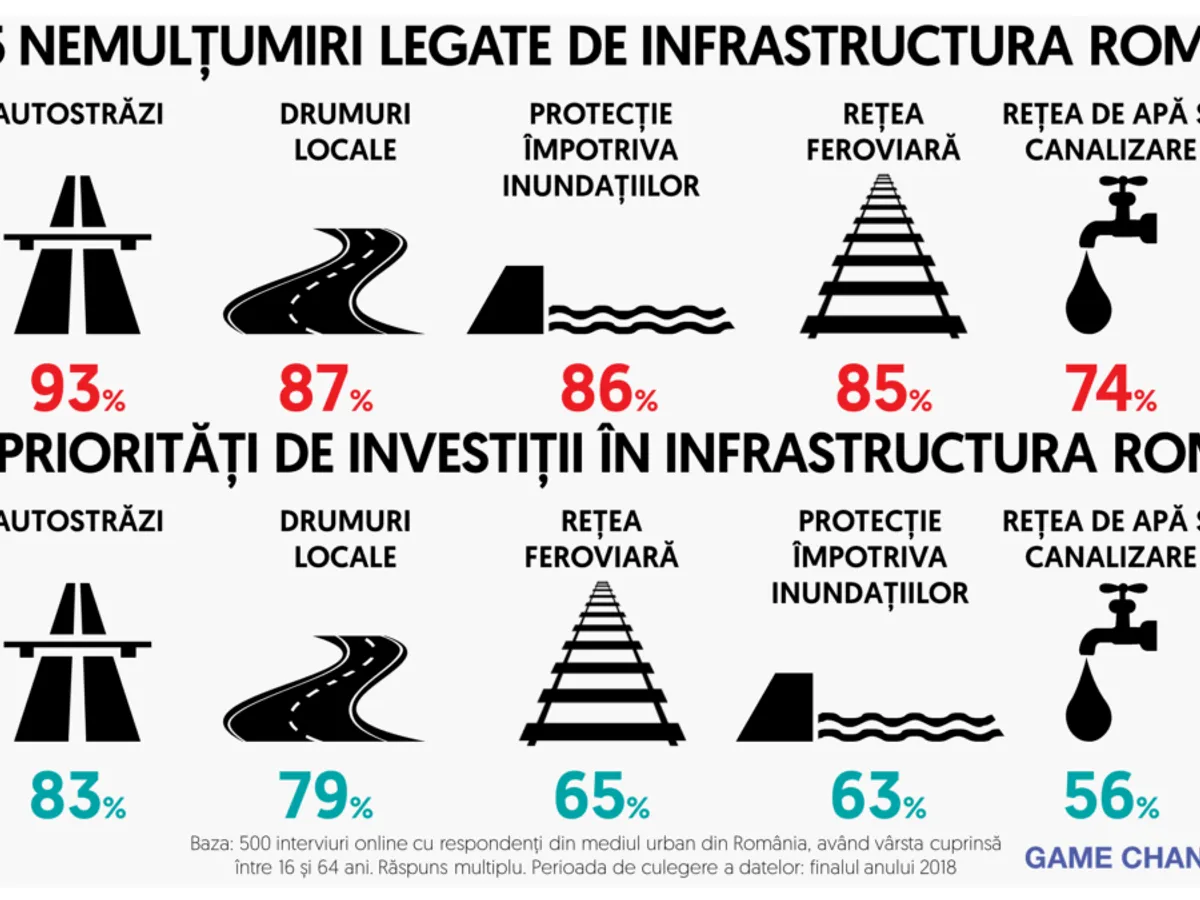 78% dintre conaţionalii noştri sunt de acord ca România, la nivel de țară, nu întreprinde destul de multe acțiuni pentru a acoperi nevoile legate de infrastructură, iar 75% dintre români sunt de acord că investițiile în infrastructură sunt vitale pentru o dezvoltare economică viitoare. La nivel global, 59% dintre respondenți consideră că țara de rezidenţă nu realizează suficiente acțiuni pentru a acoperi nevoile legate de infrastructură. 73% dintre cetăţenii celor 28 de ţări investigate consideră că investițiile în infrastructură sunt vitale pentru dezvoltare, rezultatul fiind unul apropiat de cel obținut de România.
