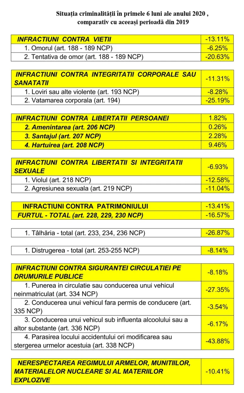 În aceeași perioadă au fost cu 12.58 % mai puține violuri și cu 11.04% mai puține agresiuni sexuale decât în primele 6 luni din 2019.
