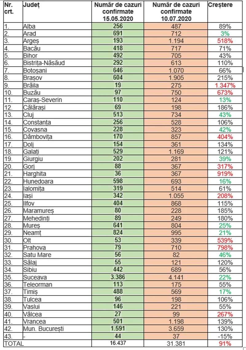 Așadar, cea mai mare creștere este întâlnită în județul Brăila, acolo unde la 15 mai erau 19 cazuri, iar acum sunt 275, adică de 14,5 ori mai multe. Urmează Harghita cu o creștere de la 36 la 367 de cazuri (919%). Interesant este că județul vecin, Covasna, se află la polul opus, cu o creștere acceptabilă, de la 228 la 323 de cazuri (42%).