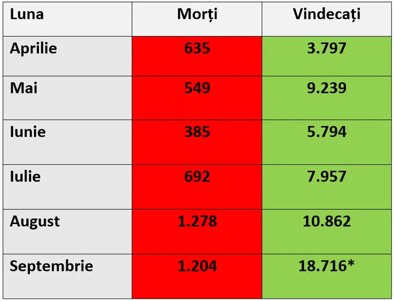 O situație comparativă a numărului de morți din cauza COVID-19 și a numărului vindecărilor de la începutul pandemiei în România arată că însănătoșirile aproape s-au dublat în septembrie, iar numărul persoanelor decedate a fost chiar mai mic decât în august.