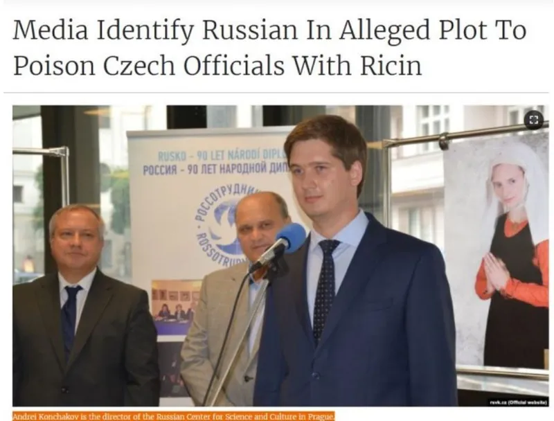 La 10 mai, mai multe publicaţii mass-media cehe au citat surse anonime din cadrul serviciilor de informaţii, potrivit cărora persoana prinsă în posesia sa cu o toxină din seminţe de ricin este un cetăţean rus pe nume Andrei Konchakov.