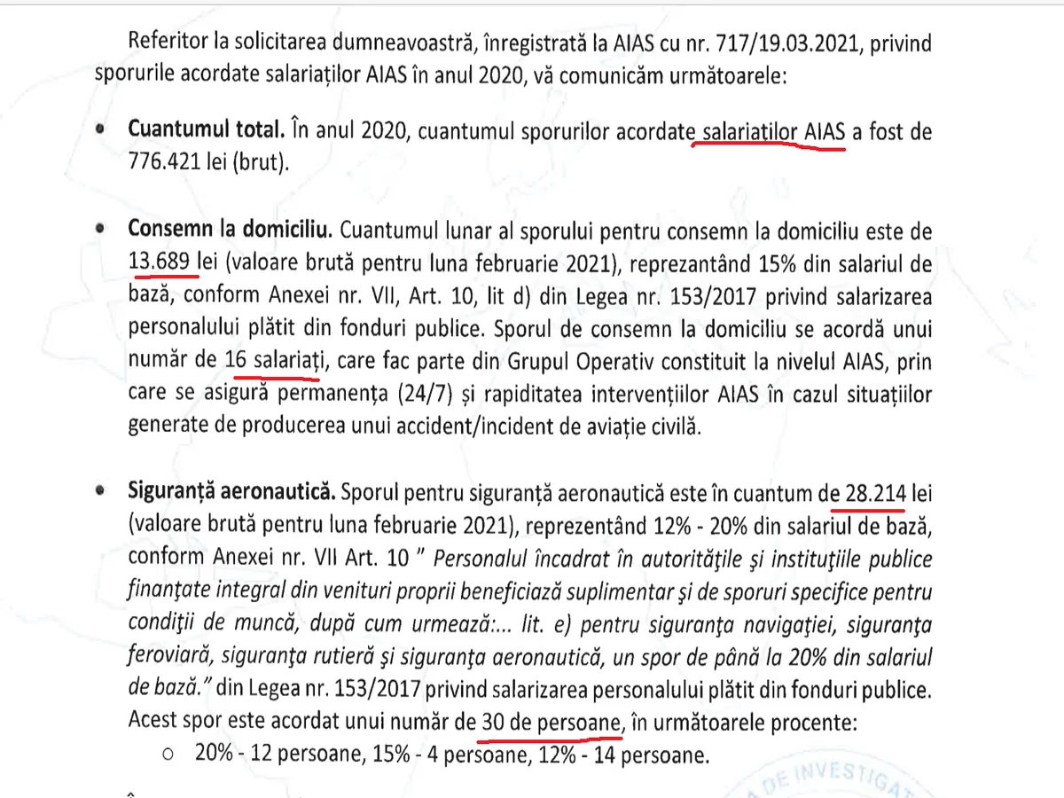 „În luna februarie 2021 a fost acordat spor de consemn la domiciliu în valoare de 13.689 de lei, reprezentând 15% din salariul de bază. Sporul de consemn la domiciliul se acordă unui număr de 16 salariați care fac parte din Grupul Operativ constituit la nivelul AIAS prin care se asigură permanența 24/7 și rapiditatea intervențiilor AIAS în cazul situațiilor generate de producerea unui accident/incident de aviație civilă”, ne-au declarat reprezentanții AIAS.