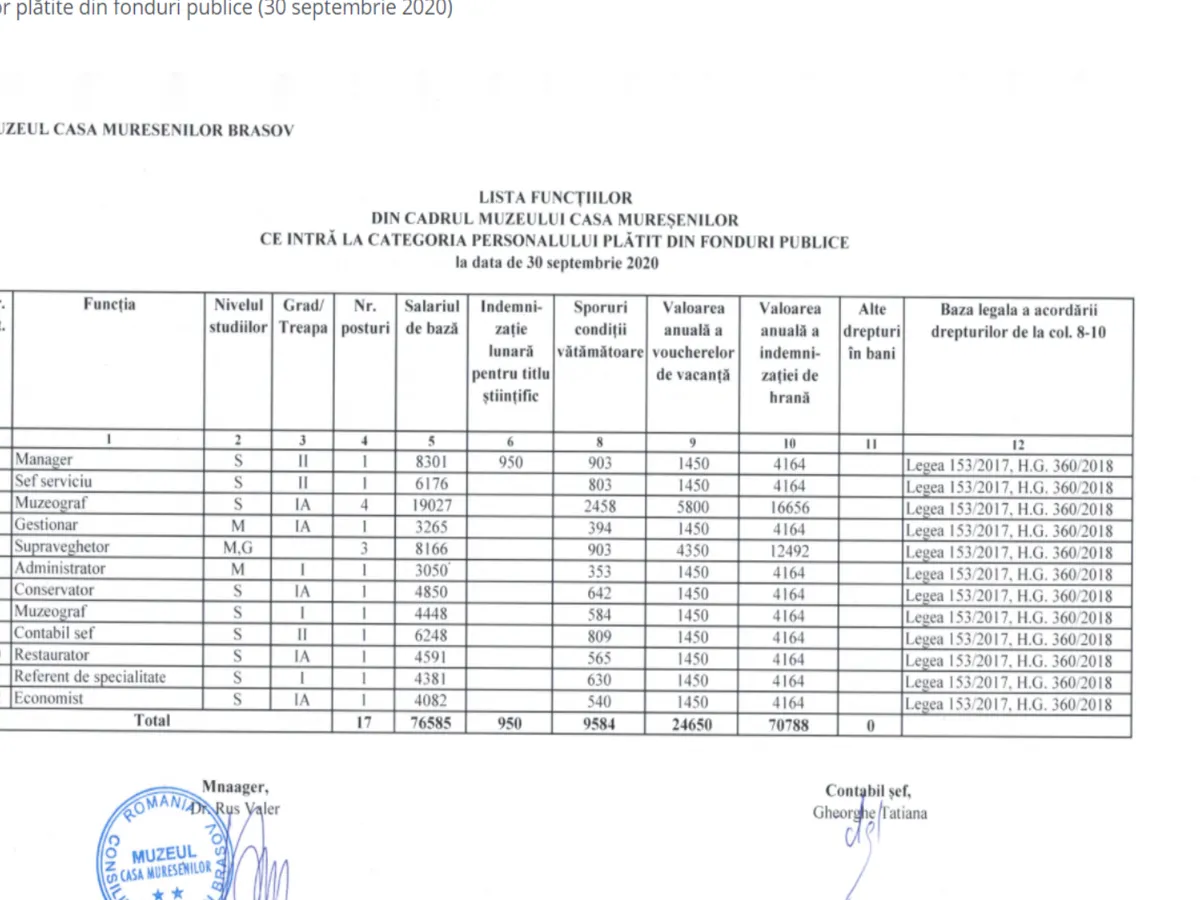 Salariile dar și sporurile sunt publicate pe site-ul oficial al muzeului. Detalii AICI.