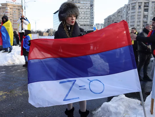 În Piața Victoriei, printre steagurile României și SUA, a fost afișat și steagul Rusiei, marcat cu literele „Z” și „Q”, potrivit Antena 3.