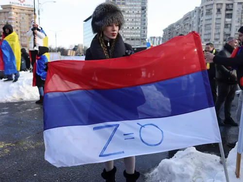Steagul Rusiei cu simbolul „Z”, fluturat mitingul organizat de AUR pro-Călin Georgescu în Capitală