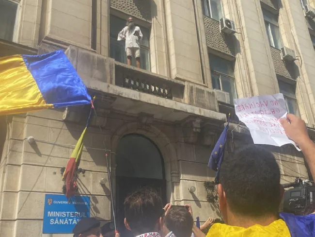 Jandarmeria a dat 6 amenzi în urma protestului anti-vaccinare obligatorie din fața Ministerului Sănătății. Bărbatul care își spune ”Stegarul dac” a fost amendat cu 1.500 de lei după ce s-a urcat pe clădirea instituției.