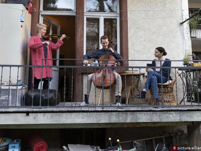 Un efect benefic l-au avut iniţiativele mai multor muzicieni cunoscuţi, cum sunt de pildă "Die Ärzte" în Germania, care au compus piese speciale sau au modificat textele melodiilor lor anterioare şi au făcut înregistrări video în care au implicat întreaga familie. Mulţi muzicieni au ieşit pur şi simplu pe blacon şi au cântat, adesea cu alţi membri ai familiei, pentru vecini.