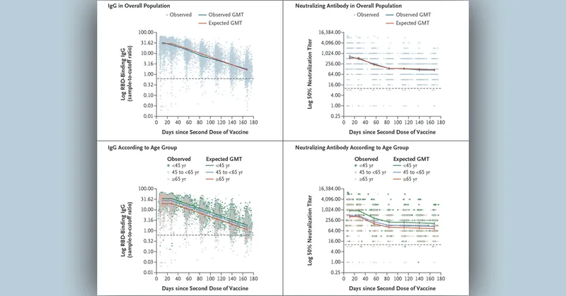 Rezultatele au arătat că, în decursul celor șase luni care au urmat celei de-a doua doze, a existat o scădere persistentă, semnificativă, atât a nivelului anticorpilor IgG (care apar la aproximativ două săptămâni după vaccinare și sunt responsabili, printre altele, de apariția unei memorii a vaccinului din organism), cât și a nivelului anticorpilor neutralizanți capabili să prevină atașarea virusului de celule și invadarea acestora. De asemenea, s-a constatat că nivelurile anticorpilor neutralizanți au scăzut inițial brusc, dar apoi mai moderat începând cu a treia lună după a doua doză.