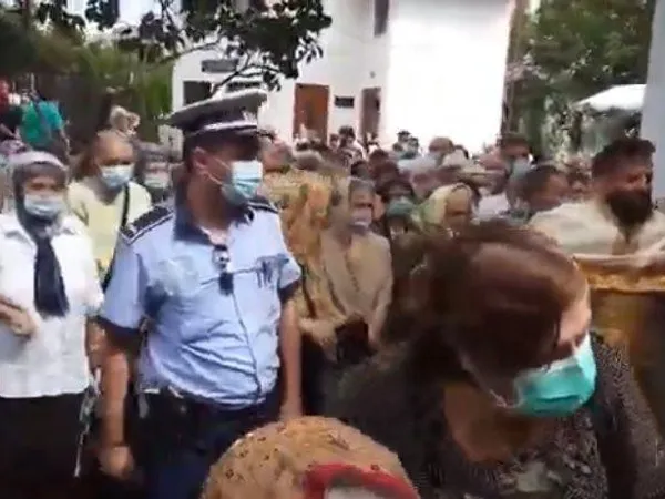 Trei poliţişti sosiţi la faţa locului i-au avertizat pe oameni: "E ultima dată când vă spunem! Staţi depărtaţi! Păstraţi distanţa! Nu ne obligaţi să dăm amenzi!”. Credincioşii s-au conformat oarecum, mulţi bătrâni făcând apel la bunătatea poliţiştilor: "Sunteţi creştini, e zi sfântă…”. La fața locului a intervenit și un echipaja de la Ambulanță, după ce unui preot i s-a făcut rău.