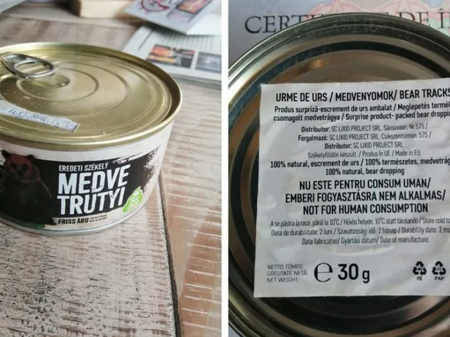 O firmă din Sânsimion, judeţul Harghita, produce și comercializează ca suvenir conserve cu excremente de urs brun transilvănean, „fără gluten, fără conservanţi, vegan”. ANPC spune că „se poate lua în mână şi mula ca o plastilină”.