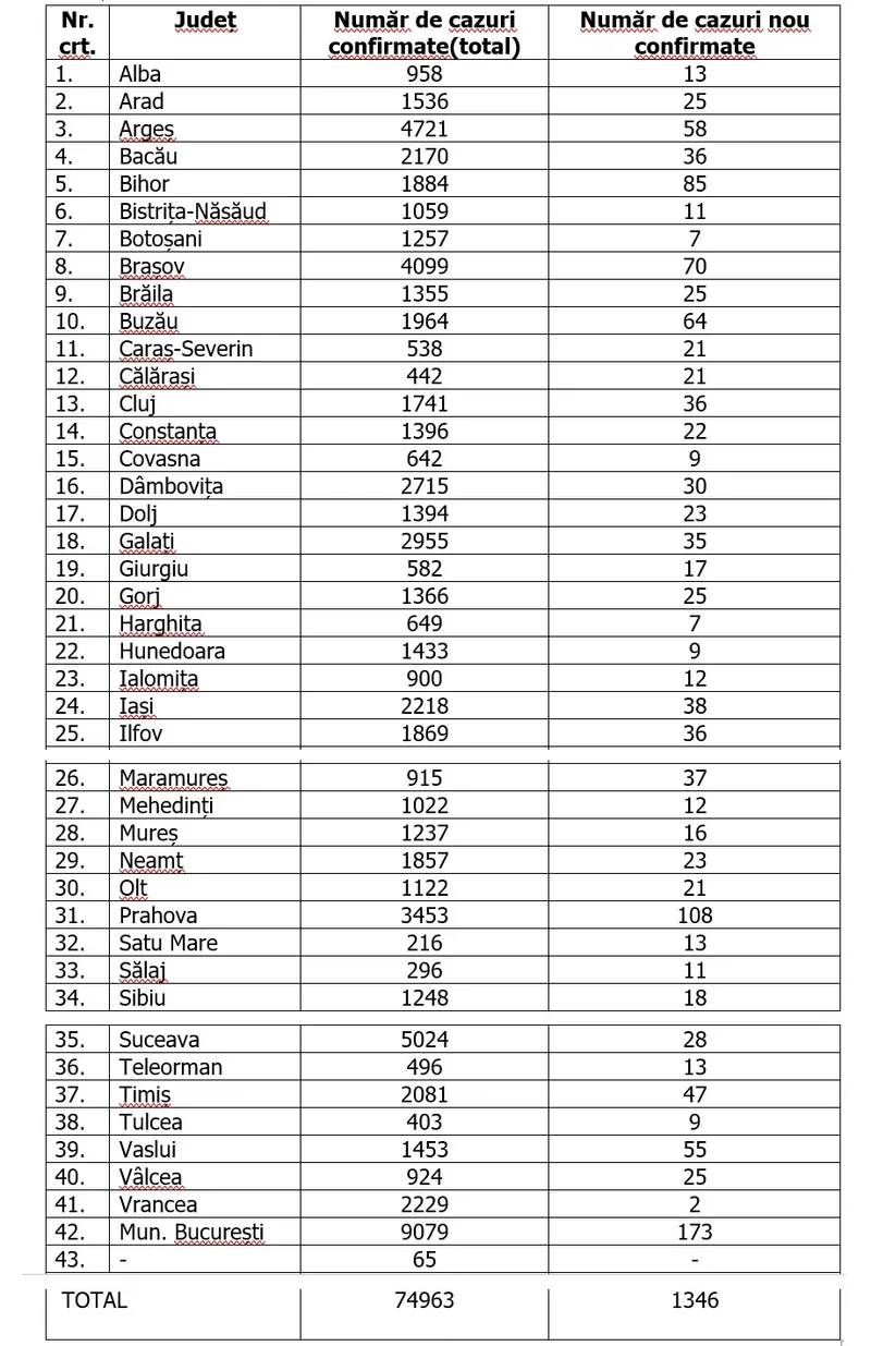 Lista județelor cu cele mai multe cazuri noi în 24 de ore: București - 173, Prahova - 108, Bihor - 85 de cazuri noi, Brașov - 70 de cazuri noi, Vaslui - 55, Timiș - 47.
