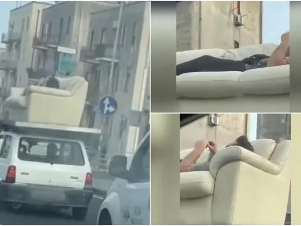 Un italian și-a găsit o nouă metodă inedită de a călători. Bărbatul a devenit viral după ce a fost filmat în timp ce stă întins pe o canapea care era transportată pe plafonul unei mașini.