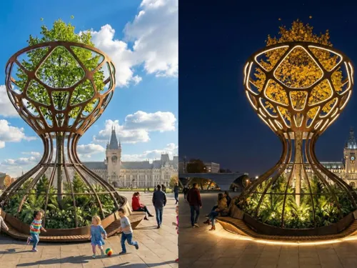 Clepsidra Vie REGENERA vrea să schimbe asta: un tei viu, senzori și un sistem de lumini care „traduce” poluarea în culori vizibile noaptea. Treci pe lângă ea și vezi, instant, „cum respiră orașul”.