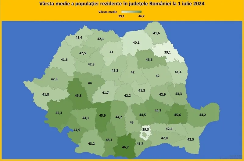 Practic, vârsta medie a populației rezidente ne arată cine trăiește cu adevărat în județ și cum arată comunitatea în termeni de tinerețe și experiență.