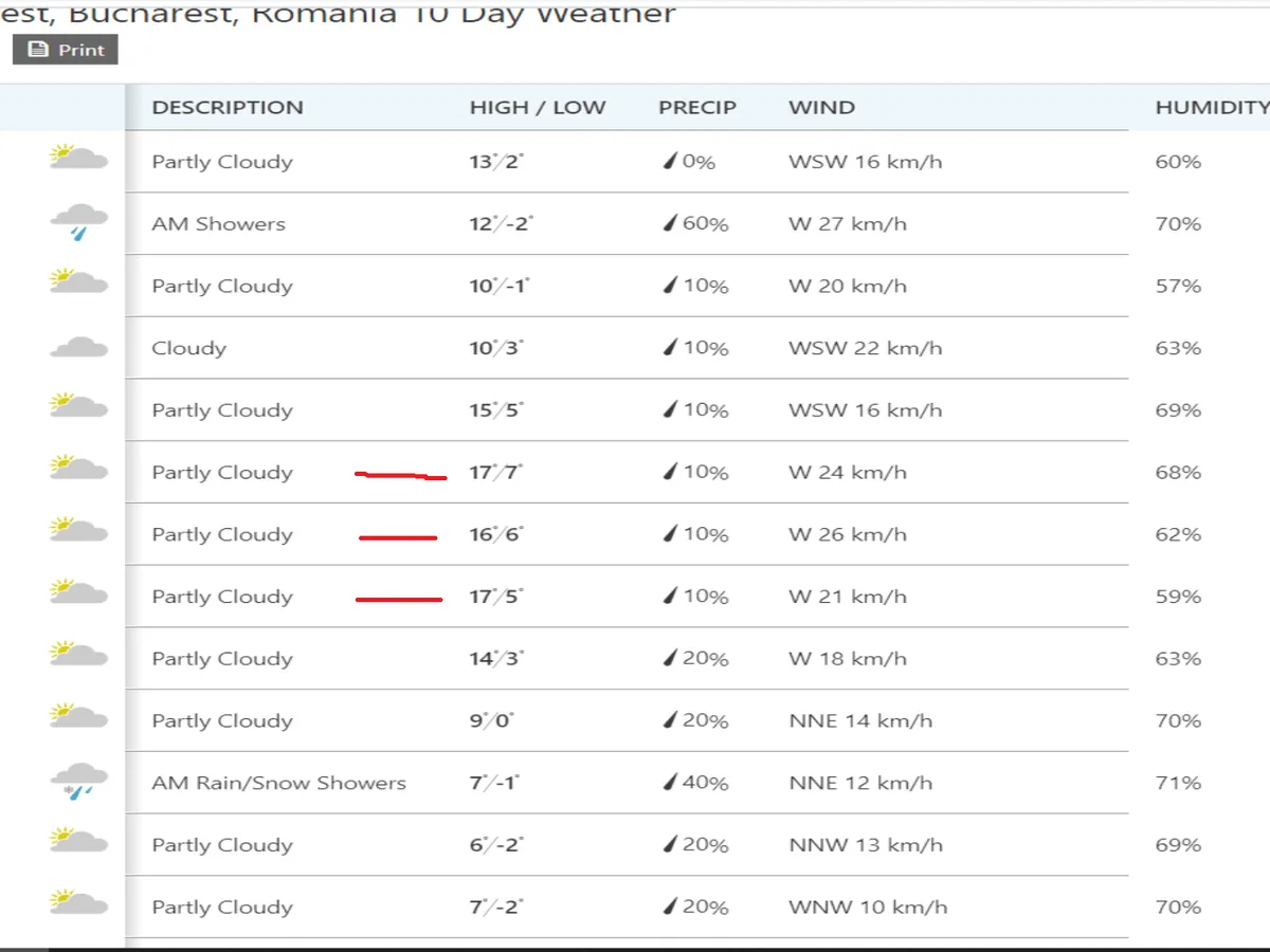 Potrivit weather.com, vremea se va încălzi mult peste media normală. Astfel, duminică vor fi 17 grade, luni – 16 grade, iar marți din nou 17 grade Celsius. Apoi, spre finalul săptămânii viitoare temepraturile vor scădea sub 10 grade dar vor fi tot mari pentru această perioadă.
