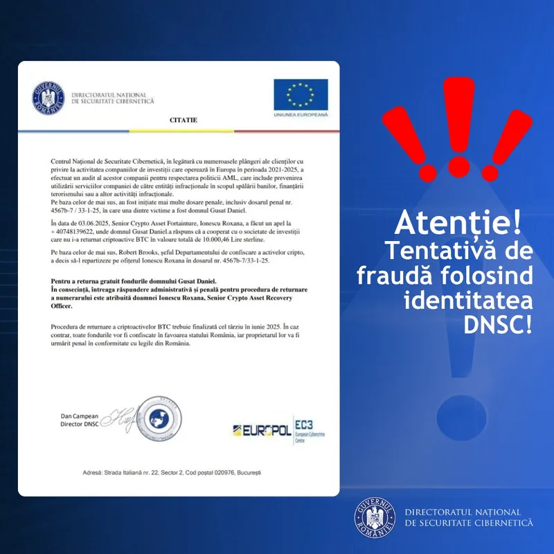 Tentativă de fraudă folosind identitatea DNSC. Nu divulgați informații personale sau bancare!