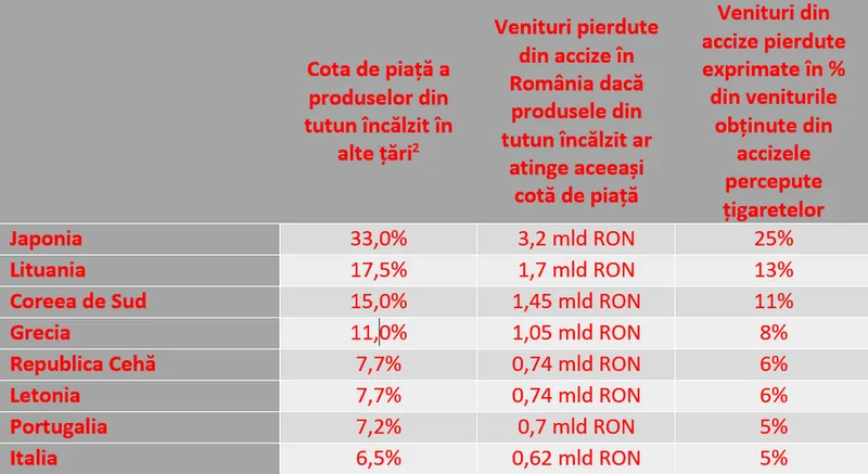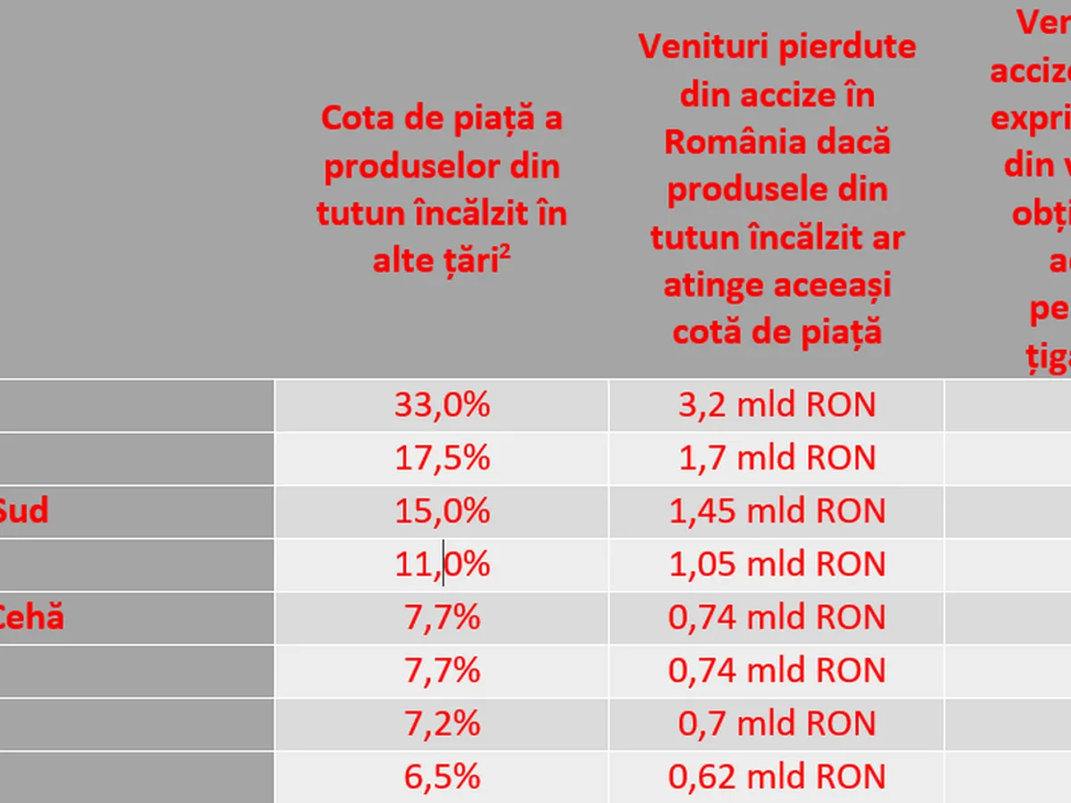 Astfel, dacă produsele din tutun încălzit ating în România o cotă de piață precum cea din Japonia, bugetul de stat va pierde în fiecare an 3,2 miliarde de lei, adică un sfert din veniturile din accize percepute țigaretelor la nivel de țară.