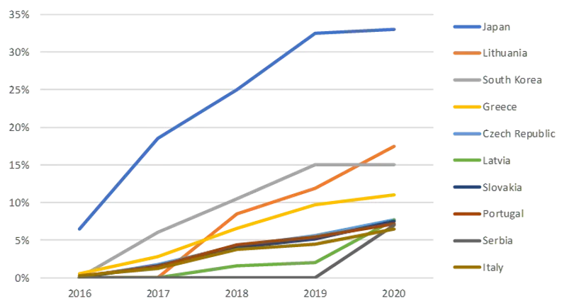 În UE, cota de piață a produselor din tutun încălzit a crescut în mai multe State Membre. Astăzi, produsele din tutun încălzit reprezintă 17,5% din piața tutunului din Lituania și 11% din piața tutunului în Grecia. În alte state membre, produsele din tutun încălzit au atins o cotă de piață între 6 și 8% în Republica Cehă, în Italia, Letonia, Portugalia și Slovacia. După cum arată graficul de mai jos, în toate aceste țări, cota de piață a produselor din tutun încălzit crește rapid.