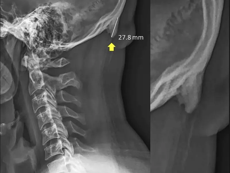 Rezultatul este un cârlig sau un corn care se ivește din craniu, chiar deasupra gâtului.
