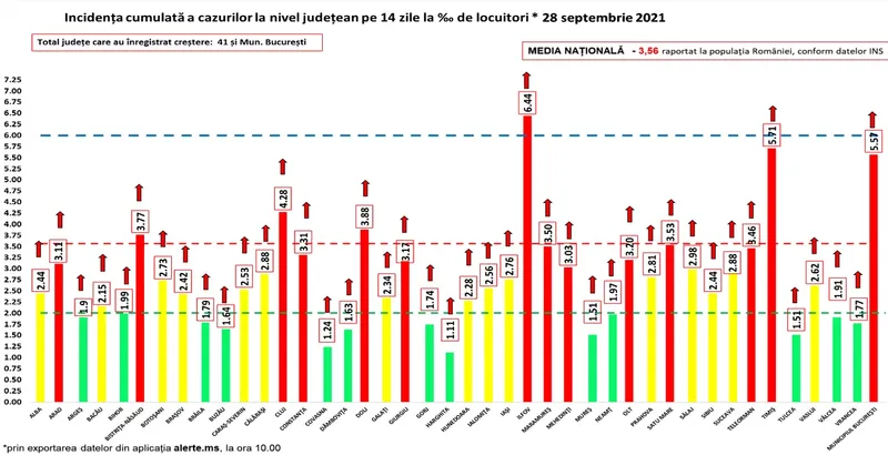 Coeficientul infectărilor cumulate la 14 zile, raportate la 1.000 de locuitori este calculat de către Direcțiile de Sănătate Publică, la nivelul Municipiului București și al județelor. Mai jos aveți graficul realizat în baza raportărilor primite de CNCCI de la Direcțiile de Sănătate Publică: