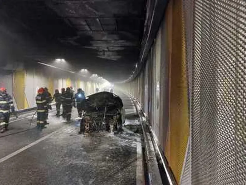 În autoturismul care a luat foc erau doi adulţi şi un copil. Maşina era la mijlocul pasajului şi a ars complet.