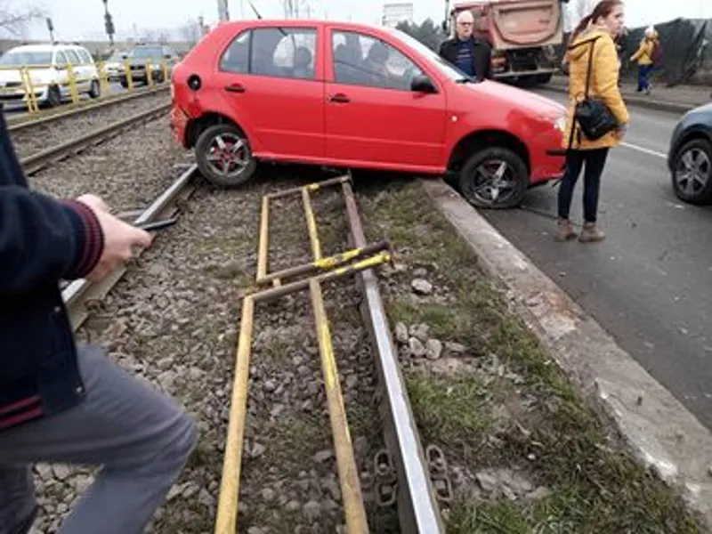 Tramvaiul 41 blocat în Crângași, autoturism aruncat pe linie în urma unui accident