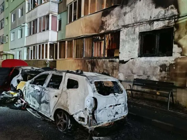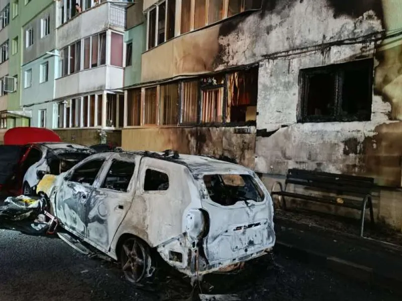 Incendiul a distrus trei autoturisme și a afectat grav ferestrele blocului situate la parter și primele două etaje.