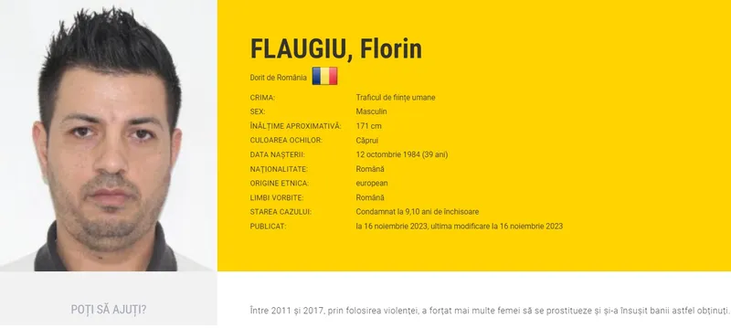 Flaugiu Florin - Între anii 2011 și 2017, prin folosirea violenței, a forțat mai multe femei să se prostitueze și și-a însușit banii astfel obținuți. Acesta a fost condamnat la 9 ani și 10 luni de închisoare.