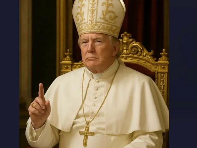 Fotografia color difuzată pe Truth Social îl arată pe preşedintele american aşezat într-un fotoliu, cu un aer solemn, cu faţa închisă, îmbrăcat în alb, purtând mitra, având la gât impunătoarea cruce de aur, cu mâna stângă sprijinită pe coapsă şi cu degetul arătător drept ridicat spre cer.