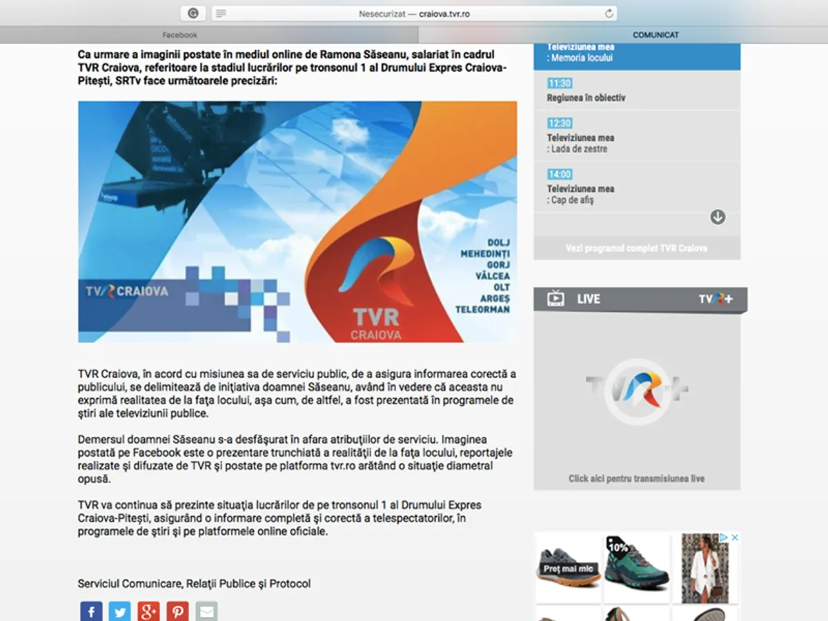 ,,Ca urmare a imaginii postate în mediul online de Ramona Săseanu, salariat în cadrul TVR Craiova, referitoare la stadiul lucrărilor pe tronsonul 1 al Drumului Expres Craiova-Pitești, SRTv face următoarele precizări: