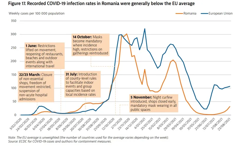 Raportul „Starea Sănătății în UE: România, profilul de țară privind sănătatea - 2021” analizează, printre altele, și răspunsul României față de pandemia COVID-19. Raportul reține că, spre deosebire de alte țări europene, România a fost lovită de boală cu aproape două luni mai târziu, înregistrând primul caz în 26 februarie, iar primele măsuri le-a luat imediat, fiind stricte.